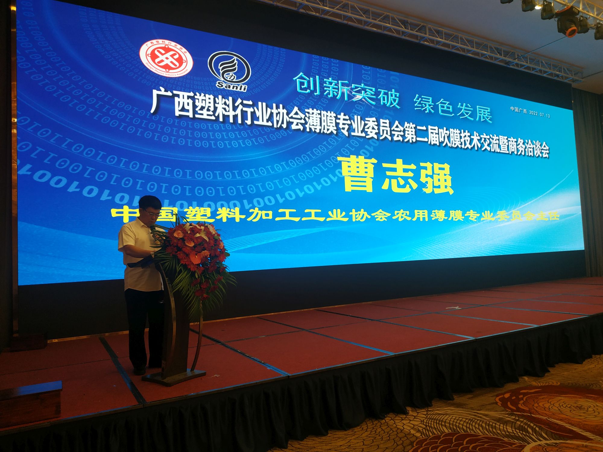 会议期间,曹志强还应邀出席了广西塑料行业协会薄膜专业委员会第二届吹膜技术交流会并致辞。